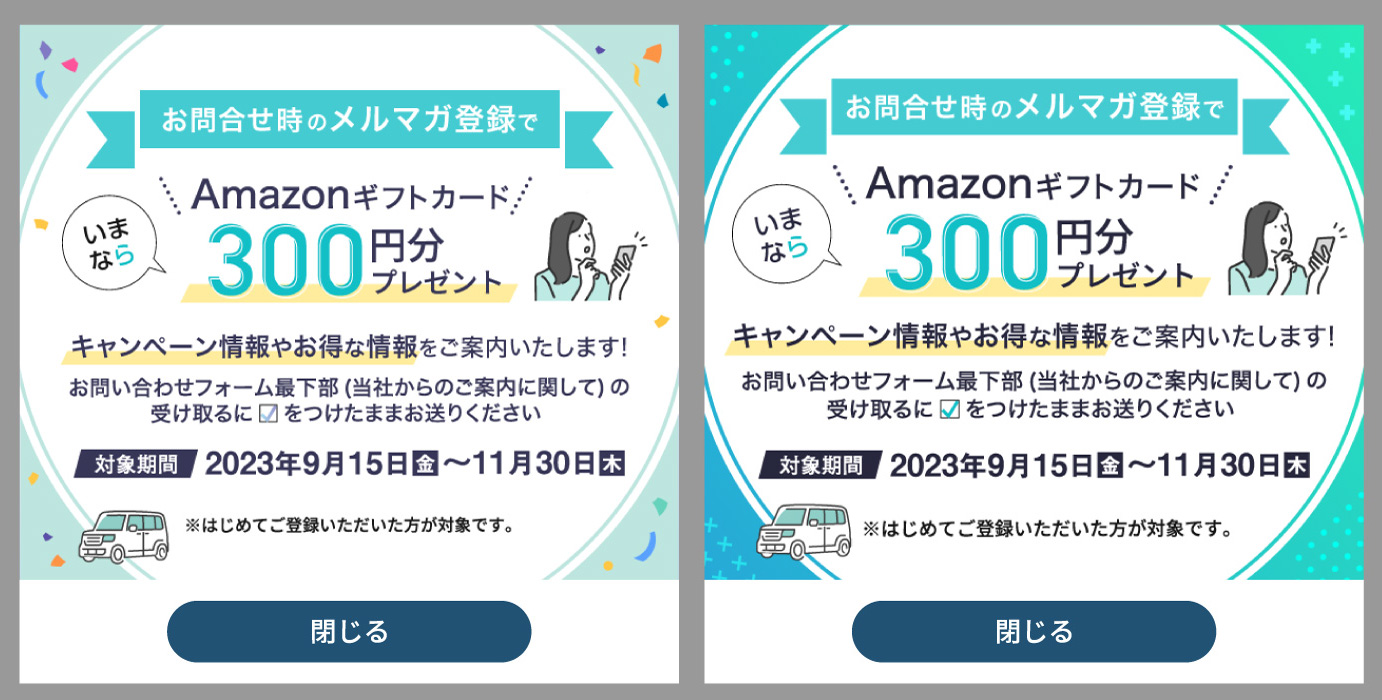 大手カーリースサイトのキャンペーン用モーダルバナーのデザインで、既存トンマナを守りつつも、キャンペーンの楽しさと重要な文字の可読性を担保したクリエイティブx2種となります。実際はx3種を用意し先方に選んで頂き、下記の1種が背景にメリハリがあるとして採用版となりました。